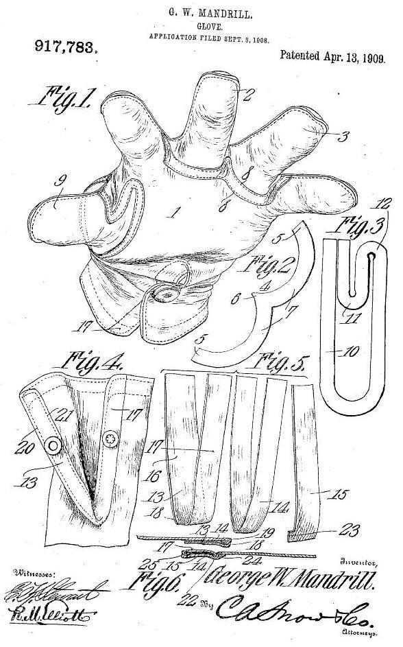 The out-seam was nothing new in glove manufacturing. I ran across dozens of patents in just a short time online. From the beginning of the patent era, Hand and work gloves used this construction. I chose this one example because it is so well illustrated and such a great design! This 1909 work glove below is wonderfully detailed and features out-seams of the fingers and sturdy reinforcements of the palm seams.