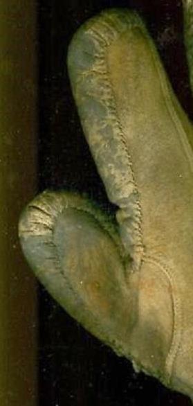 I don't know, JD. The piping is turned and the raw edge is where it should be - on the inside. Also, the way the seams are laid out, you'd have a reversed overlap on the outside of the glove if it were turned inside out (the thumb especially). Make sense? My thought when I saw it come up originally is that it was an old repair gone way wrong. Now that I've seen the patent, I'm reconsidering that. It still has some really primitive repairs, but it may be that the those weird finger pillows are original, which is a huge surprise to me. Good detective work Mike!