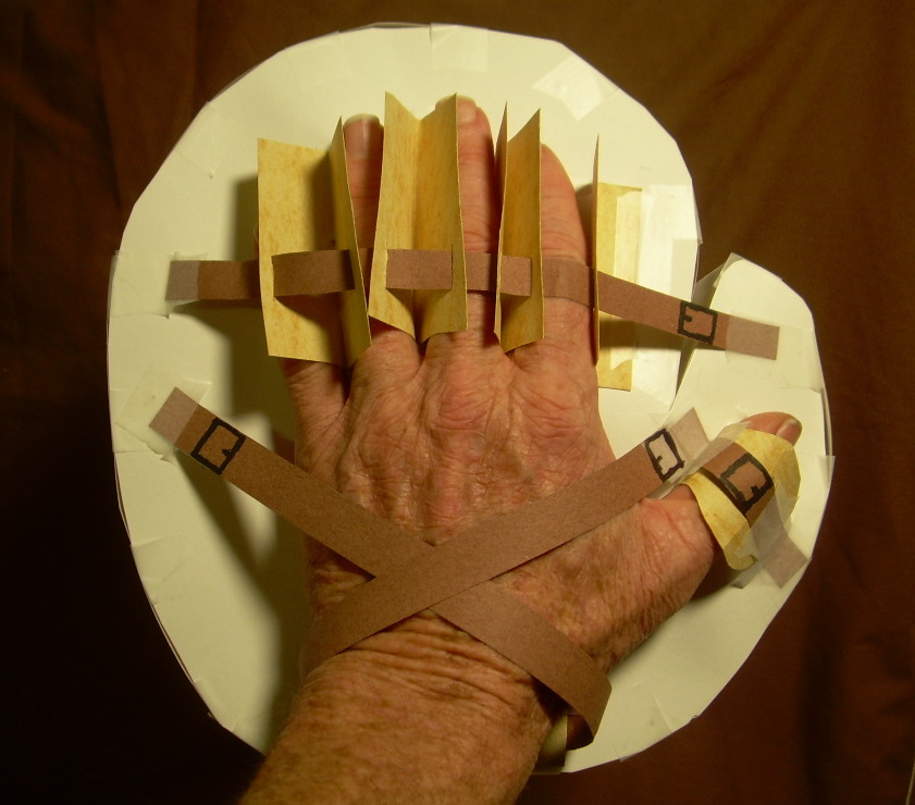I had to study this patent drawing quite a while to understand the construction. I thought it might be fun to make a mock-up of the mitt. The wedge shape yellow pieces are the "retainers" mentioned in the patent with the various brown buckle straps to hold the hand in place.
