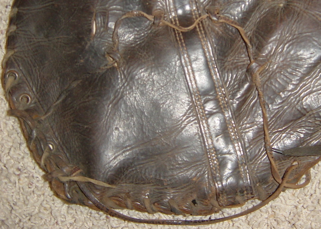 Mike, check out this one. I call this one a folk art depression-era mitt. The back has a piece of rawhide to place your fingers through. It's fun to think of some kid asking his mom for a new glove but they didn't have the money so the ever-resourceful mother whipped this up from a shoe, a belt and a purse. I absolutely love this one.