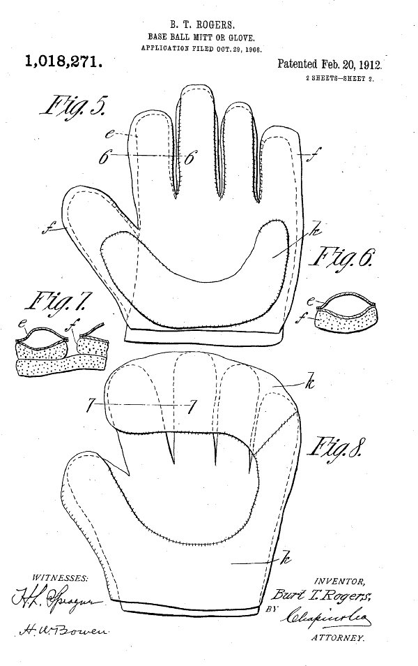 The fielders mitt was something of a hybrid having the the flexibility of a glove coupled with the greater surface area of a mitt to catch a ball. This 1912 patent by Burt Rogers for Victor Sporting Goods encased a glove in a sheath of leather. The design is really a refinement of Joe Gunson's original 1885 invention.