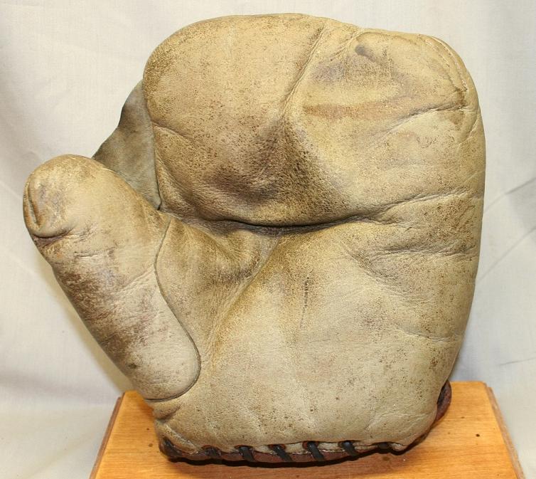 This nice looking fielders mitt is from an ebay auction. It is pretty similar to the preceding examples. I was trying to determine the manufacturer from the worn patch. I am not really familiar with early glove patches. I was hoping it would be discernible enough to be a "Victor" model. The patch seems to be red lettering on a white background. I don't recall "Victor" having that color scheme. The only other choices in my limited knowledge would be either a "Diamond" brand or "Edw.K.Tryon". I wonder if anyone else has ideas.