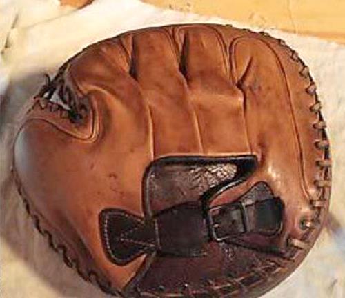 The Victor "Combination" mitt formed a pocket by segmenting the front and back of a catchers mitt into four seamed sections. The front seams were covered by a circular stitched reinforcement. A nice looking mitt