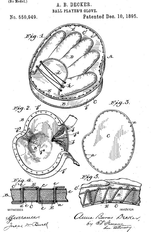 mikesglove wrote: Anna Burns Decker of Keokuk was listed the inventor of a catchers mitt in 1895. The patent of Decker was innovative for the method of constructing a catchers mitt out of three replaceable sections, the front face, the perimeter band and the gloved back section. All three sections were joined by lacing instead of the usual stitched seam. Decker sold her patent to Frank Brogan, Manufacturer of Baseball Goods in nearby Iowa City.