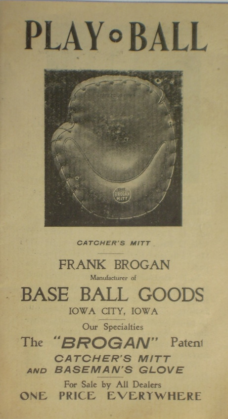 Decker sold her patent to Frank Brogan, Manufacturer of Baseball Goods in nearby Iowa City. This ad below is from a catalog circa 1899. note the lacing through the face of the mitt.