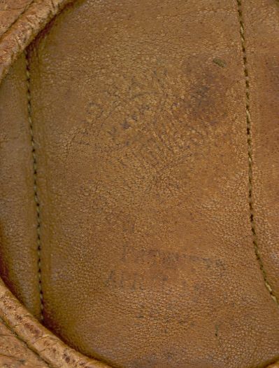 The design of the glove being cut from one piece of leather and wrapped over from front to back with finger holes cut in the middle is distinctive and clever. The auction example shows this well. The Spalding glove as it was manufactured included improvements to the Kohler patent. The thumb seam especially is more elegantly conceived and placed. The patent drawing shows the thumb opening sewn as part of the perimeter seam and the actual Spalding glove shows the thumb hole being cut away from the perimeter seam.