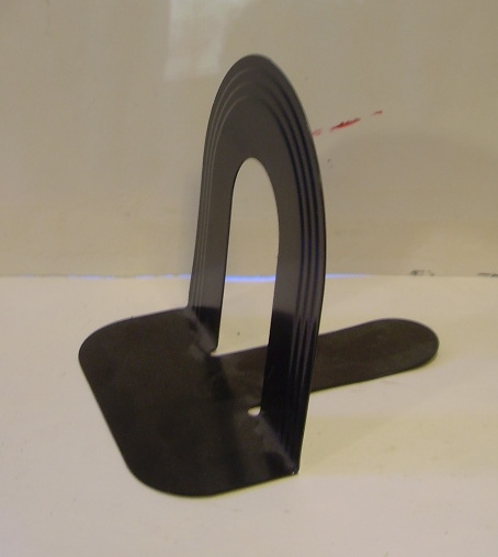 I use a standard black metal book end. they are sturdy and can support a large catchers mitt. They can be bent back as shown in the picture to keep a glove from falling forward.
