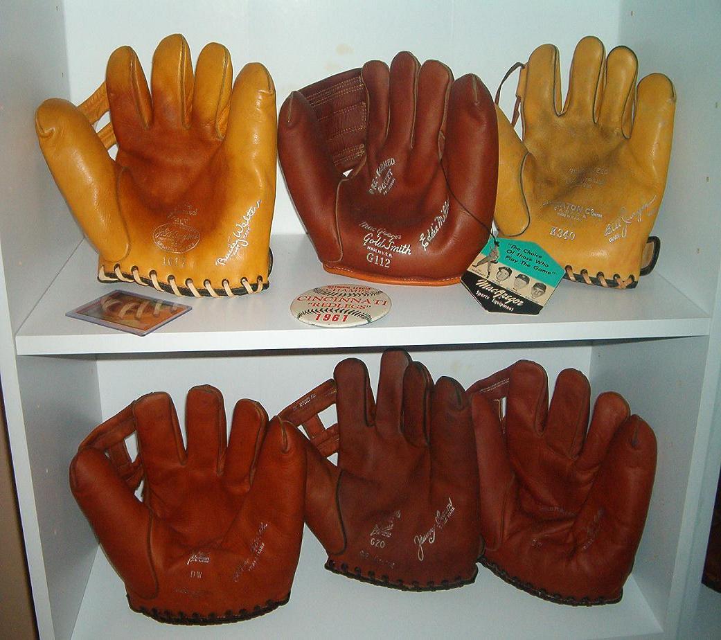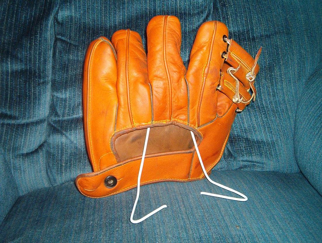 What I have used for mine are those large paperclips on a stand things you get at Office Depot. I think they are meant to hold notes. I have also used the spike type stand used to put a ticket or receipt on when it has been processed. they are in the same area of any office supply store and they are cheap and you can bend them to the angle you need to keep the glove upright. When i first started out I used these stands exclusively but I wanted to display more gloves so i came up with a way to hang them on the wall. I went to Lowes or Home Depot and found the cheapest doorway trim I could find, the 2" kind and i found a stain that matched the furnitire in the room i was hangin it in. I stained the long piece and then got small cup hooks for regular gloves and then larger hooks for my catchers and firstbasman mitts and handscrewed them into the wood at the distance that would allow the gloves to lay the best. I then hung the wood laterally along the wall that way i could put several rows up and display more gloves without having to have all the furniture to do it.