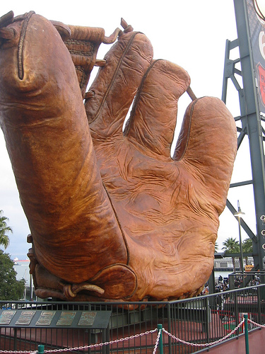 At the Cooperstown chapter SABR meeting today, we had a virtual tour of San Francisco's AT&T Park. In the left field stands, by the Coke bottle, is a giant mitt. Does anyone know if this mitt has a maker's brand on it?