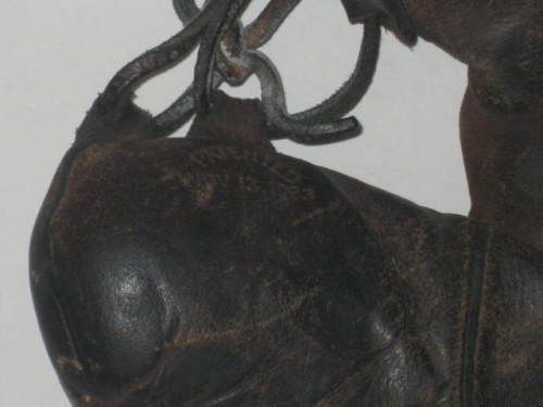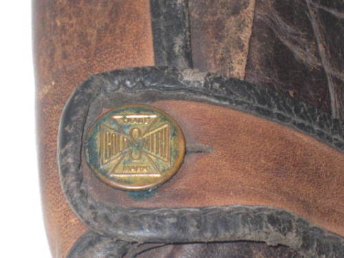circa 1925 Goldsmith model 67 for $58 on ebay. Glove looks to be in good shape with legible markings in the pocket. No cloth patch on the back but a nice logo button. The 1923 patent date stamped on the thumb refers to the tunnel loop web, a Hugo Goldsmith invention.