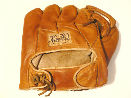 A nice looking 1930's KenWel "George Selkirk" model 544 glove sold for $92 on ebay. Similar to the Vim "Selkirk" model but with the distinctive KenWel features reversed. This glove has the "NerverRip" back panel but is missing the laced fingers.