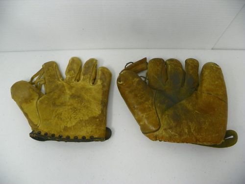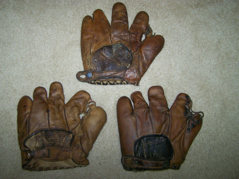 A lot of three interesting gloves sold for $100 on ebay. One glove identified as a Reach model is in good shape with an intact cloth patch and simple laced web. The D-ring glove could be a Wilson Or J.C. Higgins. Nice tunnel loop web. The third features the 1930 Rawlings patented adjustable strap web. Pretty good purchase for the buyer in my opinion