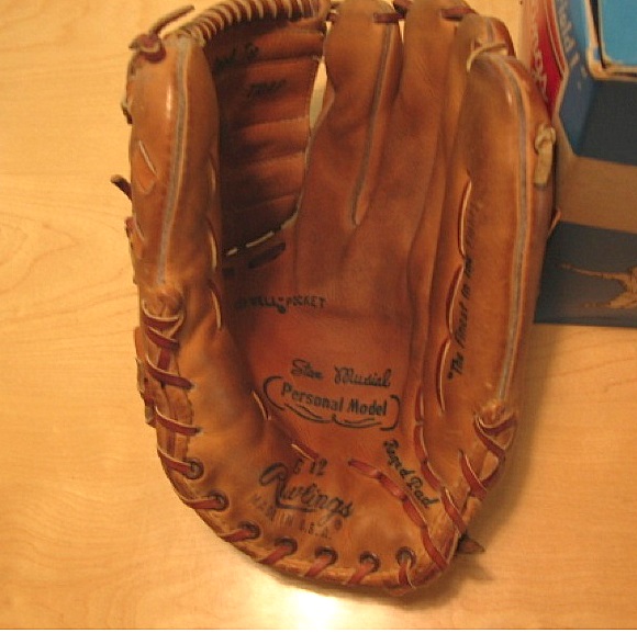 This Lefty three finger model took a little research. I thought it was a full web at first but the web is actually a Rawlings 1930 patent adjustable strap web. The patent number is still mostly visible on the pinky side of the heel. This Glove is an odd one with the fat finger being the first and second combined. It was called the Rawlings "Special" and may have been made in just one year, 1932.