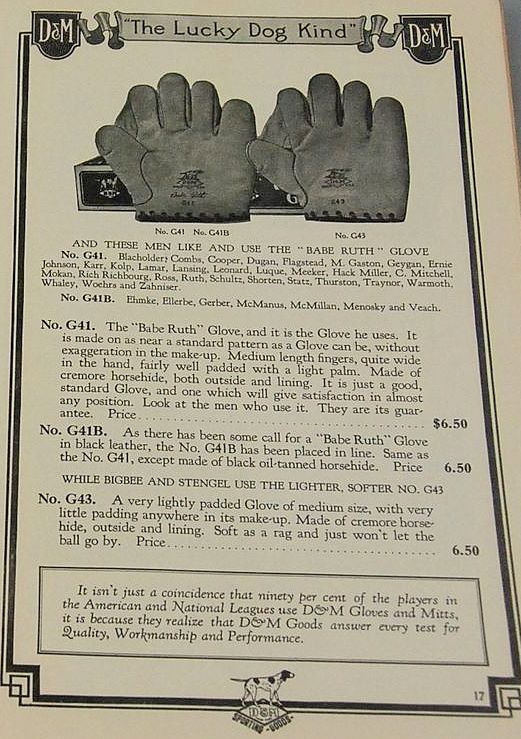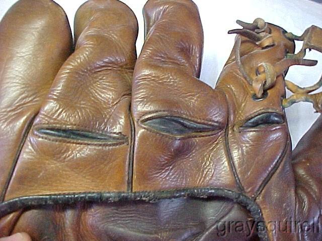 A circa 1940 Goldsmith "Joe Cronin" model glove sold for $255 on ebay. The front looks pretty standard but the back is really unique. The adjustable strap webbing is intricate, somewhat reminiscent of the "Rainey Trap" web and the leather gussets at the knuckles to add flexibility to the fingers is pretty cool looking. In the late 1930's, various patents were introduced, such as the Wilson "KurvForm" to shape the fingertips forward to create a more hollow ball catching surface. This particular glove may be related to the 1939 O'Hara patent used by some of the glove manufacturers in competition with Wilson. This is a nice glove with great markings in the pocket and overall in fine shape