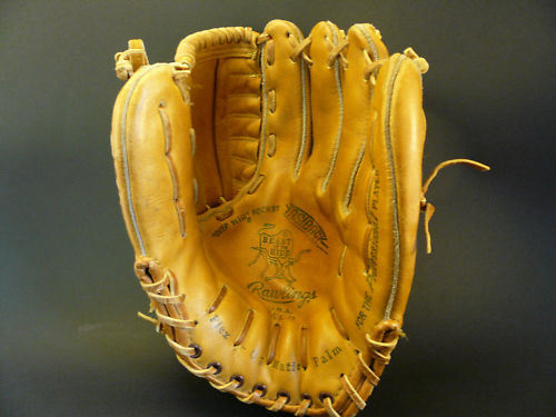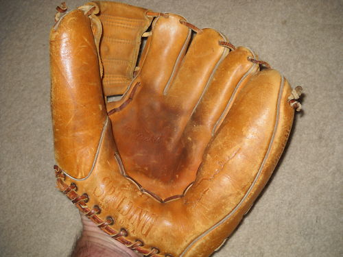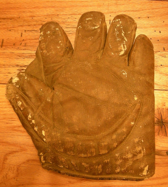 A circa 1940 Goldsmith "Joe Cronin" model glove sold for $255 on ebay. The front looks pretty standard but the back is really unique. The adjustable strap webbing is intricate, somewhat reminiscent of the "Rainey Trap" web and the leather gussets at the knuckles to add flexibility to the fingers is pretty cool looking. In the late 1930's, various patents were introduced, such as the Wilson "KurvForm" to shape the fingertips forward to create a more hollow ball catching surface. This particular glove may be related to the 1939 O'Hara patent used by some of the glove manufacturers in competition with Wilson. This is a nice glove with great markings in the pocket and overall in fine shape