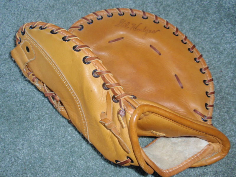 A 1960's Wilson "Gil Hodges" model base mitt sold for $99. A good quality mitt. Lambs wool wrist padding, leather piping. Interesting web controller design.