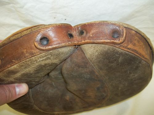 A rare early 1900's D&M crescent pad catchers mitt sold for $323 on ebay. The price would have been higher if not for the missing buckle and strap on the back of the mitt. The buckle itself is an oval type and distinctive to D&M mitts in that period. It may be hard to find a replacement, although William may have a donor. The mitt still has a lot going for it with a sewn double faced pocket reinforcement, belt type heel lacing and riveted strap at the top. These are patented inventions of Jason Draper and Albert Burtt, a long time employee of D&M.