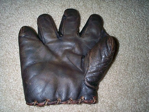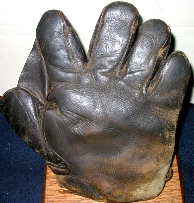 I enlarged the back view of the Wagner glove because I thought it was interesting. It looks like part of the lining was purposefully cut out to form a deeper pocket. I don't know how Brett fells about it but I would leave that alone and unravel what remaining leather there is to cover the felt pad and put a backing in place to keep the remnants together and hopefully the finger and thumb stalls are intact. I would probably be against stripping it out and making a whole new lining. I personally like the cutout pocket section a lot because it identifies an historical period really well.vintagebrett wrote:This J.C. Higgins Honus Wagner sold for $344 in Hunt's Internet Auction. Looks like it could be a really nice deal if restoration is done correctly.