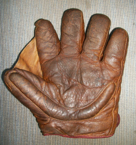 A 1905-15 crescent pad glove sold on ebay for $471. The glove is in remarkably good shape with little soiling of the leather, wool lining, cloth piping or stitching