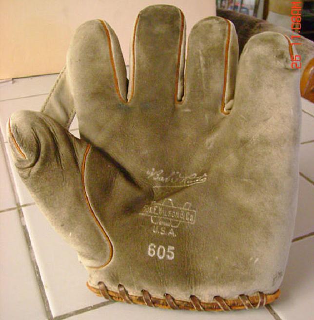 I'm with Bert on this one. I LIKE IT! I have a bunch of white gloves and similar sewn webs and I believe the stampings could remain in tact with that type of leather. It looks like a smooth soft leather, not a nappy or buck type leather like a G41. A different type of leather would have made me question it more. It's hard to say without actually having it on my hand but what's the worse case scenario - that it was touched up? With a one in three glove model known (Wilson 605 Ruth), and the toughest, rarest Ruth model on the planet, it wouldn't bother me for a minute because it is still stunning. I'm just glad that it came out to play after all these years. We had all known about it from Joe's Newsletter 15 or 20 years ago but didn't know where it was.