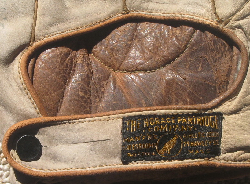 A 1915-20's Horace Partridge 1" web glove sold for $456 on ebay. the glove itself is in pristine condition with nice markings in the pocket which are pretty rare with this type of white leather. The glove also features a variation of the Stall & Dean patented pocket. The circular stitching inside the wrist opening defines an area where the padding was reduced to more quickly form a pocket on the face of the glove. Also, a great cloth patch and only a minor flaw in the inner lining.