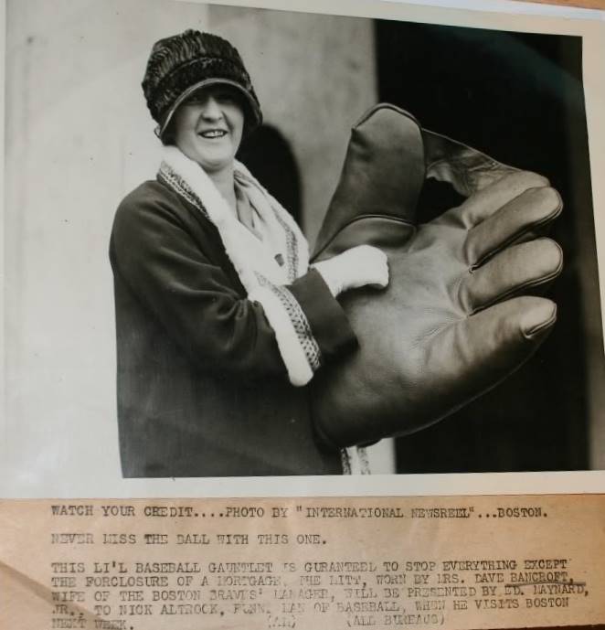 John Edward Maynard was a co-founder along with Jason Draper of the Draper-Maynard Sporting Goods Co. in 1881. Maynard married Jason Draper's sister and in 1885, they had a son, John Edward Maynard Jr. John Jr. was nicknamed Ed to avoid confusion in the household. As an adult, John Jr. went by his middle name of Edward. By 1914 Edward was an officer and shareholder in the Draper Maynard Co. He became something of a spokesman for the company and did much of the public relations. One notable picture shows Mrs. Dave Bancroft wearing a huge D&M glove that Ed Maynard was to present to Nick Altrock, the "Funny Man of Baseball" before a baseball game.