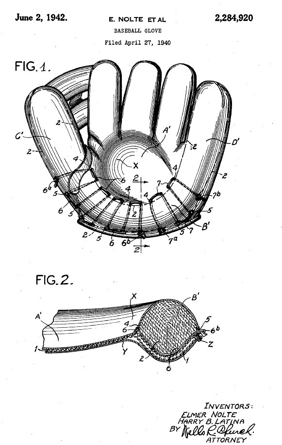 Here is the patent by Elmer Nolte and Harry Latina in 1942. You can see how the pocket lacing is tied into the heel lacing, just like your glove.okdoak wrote: Do you have a graphic for the 1942 Rawlings patent? I swear I've seen one but can't find it now. I have a Rawlings Merril May with the laced down pocket. Think it's interesting that it didn't really seem to catch on until about the mid-fifties. It just wasn't offered on most of Rawlings' models before then except for the Red Rolfe.