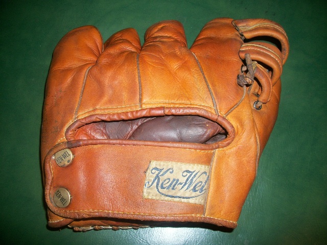 Here is one of my favorite Ken Wels. The K in the logo is made up of crossed bats. It's the only full web I have ever seen. I need to find my suede brush. Also love my flat top lefty catchers mitt.
