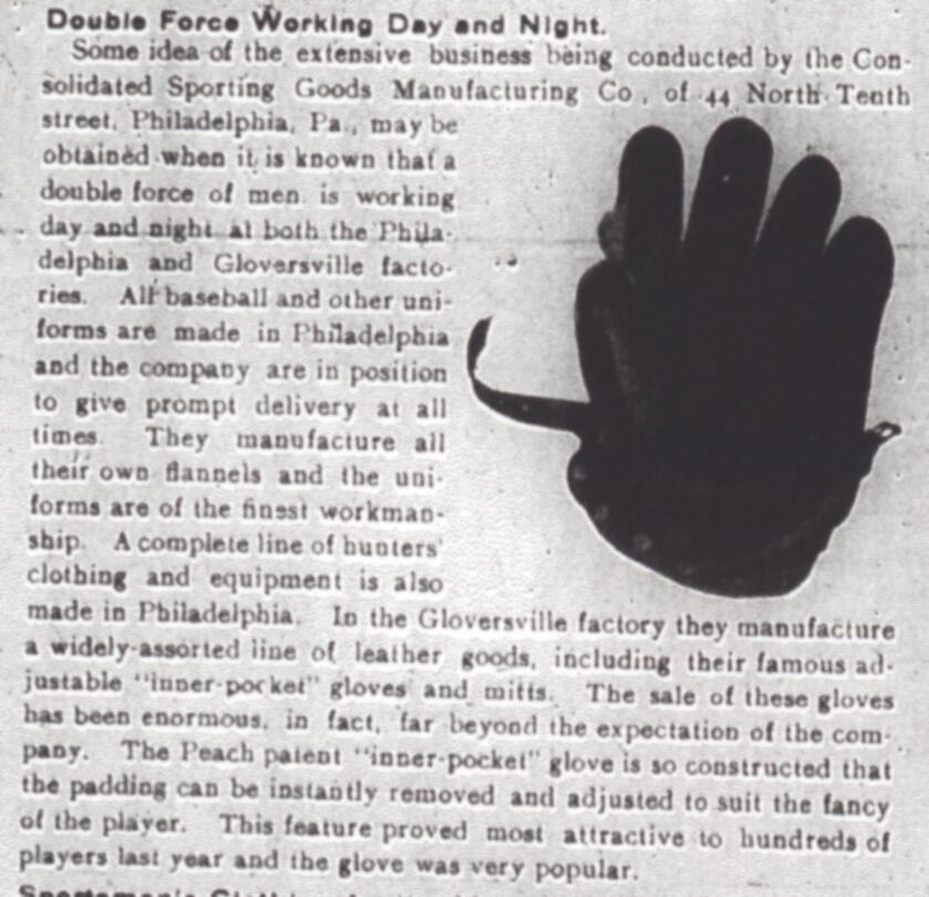 mikesglove wrote:the close-up below of the 1911 Peach fielders gloves shows a unique feature of reinforcing tabs at the base of the thumb and fingers. I couldn't find a specific patent for that from J.A.Peach or anyone else but still pretty cool.