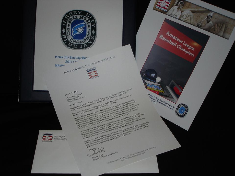 OK, so last Fall I corresponded with the Curator at the National Baseball Hall of Fame and Museum regarding their amateur baseball exhibit. My ball team had just won our league’s championship and I was trying to get us “inducted” into the Hall, if just for a day. Well, the Curator, a Mr. John Odell, is a true gentleman, and he went above and beyond to make sure that our team was, in fact, temporarily represented in the exhibit and sent along a beautiful letter of congratulations on behalf of the Hall of Fame. So you can see what I’m talking about, I have attached an image of my team photo, hat, league baseball, and championship medal, along with the HoF letter that he displayed in the museum for us back in February.