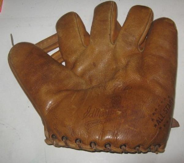 Here are some photos of the Ed Maynard glove. It is an "All Star" model and has a strong manufactures stamp in the pocket featuring a dog with the saying " The Sign of the Little Dog". Let me know if you are interested.