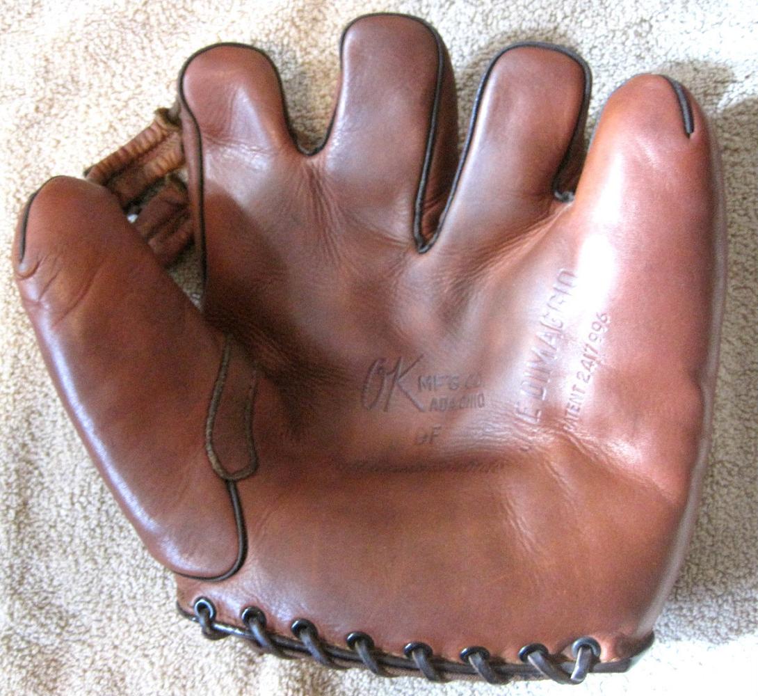 A 1940's OK brand "Joe DiMaggio" glove in near mint condition sold for $685 on ebay. Great looking and a unique patent design.