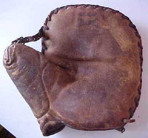 A 1930's Spalding "Sam Leslie" model base mitt sold for $148. Expensive in its day and rarely seen now. Top of the line quality. Has the unique snap back wrist strap that Spalding/Reach used from the 1920's till the 1940's on some of their top mitts. I like the vintage athletic tape on the home made web. To me that adds a lot of character to the mitt.