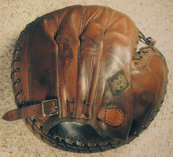 Well anyway, my wife plans to figure some way to display the glove and give it to my son for his birthday. I want to write up as much information about the glove I can learn (starting with the AJ Reach history I have already found). I am curious as to what anyone can tell me about this particular mitt. It is 10" across and the front is fully intact with no tears. I can just barely make out some print on the front but it is so worn as to unreadable. The back of the mitt that would be against the back of an inserted hand is torn in several places but the mitt still fits easily on the hand and would be usable (something I guarantee my son will try before retiring to display).