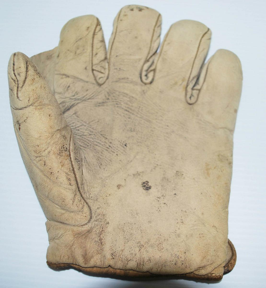 An interesting short fingered Spalding full web glove sold for $375. Leather is in really nice shape. Previous owner hand sewed his own tag to the inner lining, very tidy.