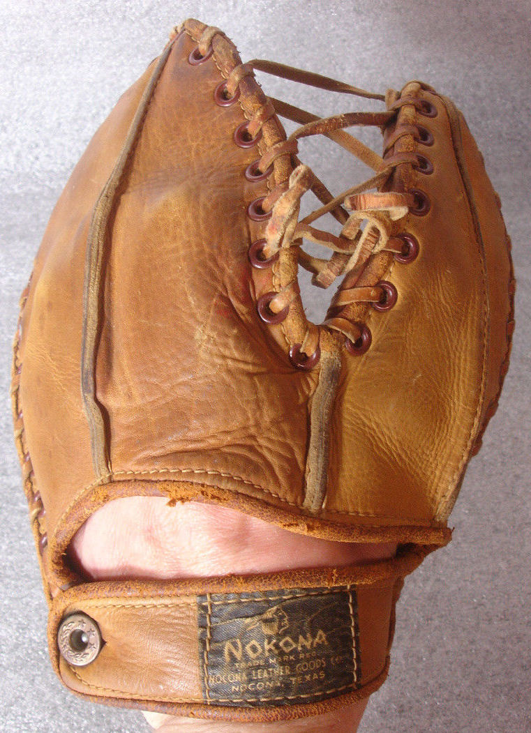 A 1940's Nokona "Joe Jackson" model BM71 base mitt sold for $150. Interesting design similar to "The Latch" model. Mitt shows light wear with the endorsement and tag in good shape.