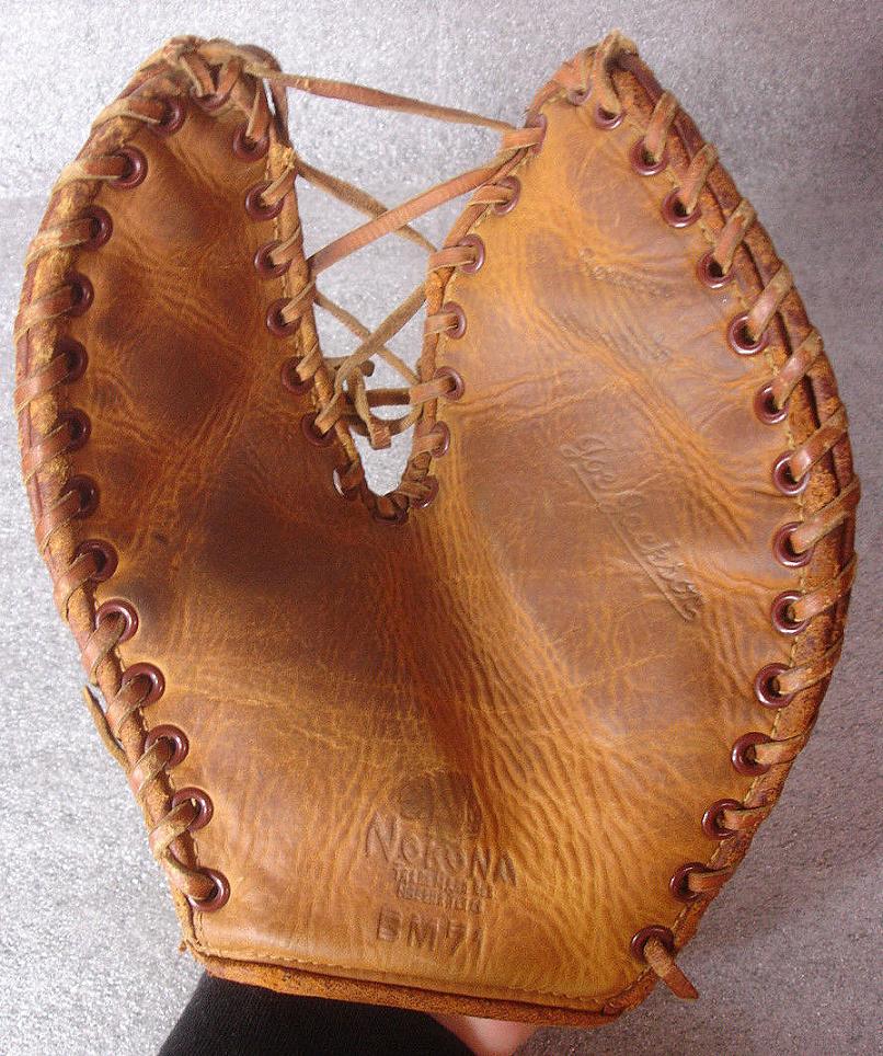A 1940's Nokona "Joe Jackson" model BM71 base mitt sold for $150. Interesting design similar to "The Latch" model. Mitt shows light wear with the endorsement and tag in good shape.