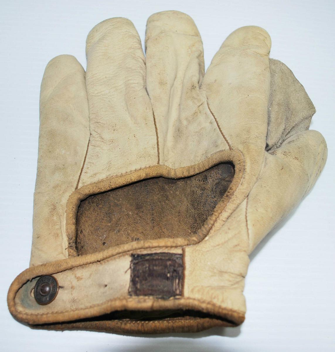 An early full web buckle back glove sold for $260. Felt lined model with the rare quick release buckle and arrow head wrist strap. The glove has seen a fair amount of use with the cloth patch missing from the back of the middle finger stall. Possibly a Stall & Dean or Wm. Read & Sons glove. No markings on the front.
