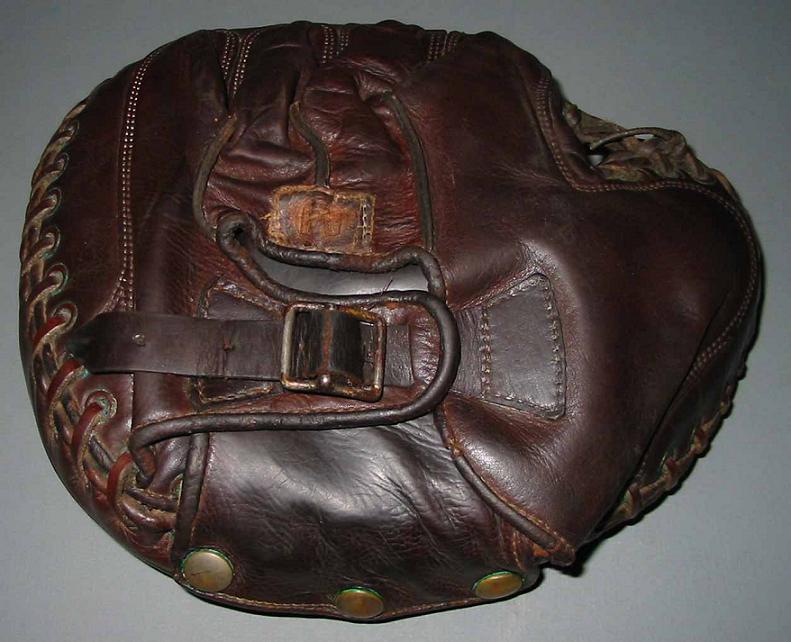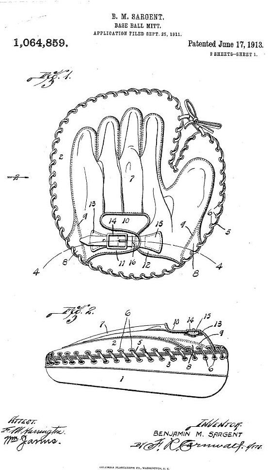 In 1913 the inventor B.M. Sargent as assignor to Rawlings, patented several features as improvements to the catchers mitt. First was a tapered perimeter leather band joining the front and back of the mitt, second was a molded pad forming a pocket and third was an overlapping leather wrist protector