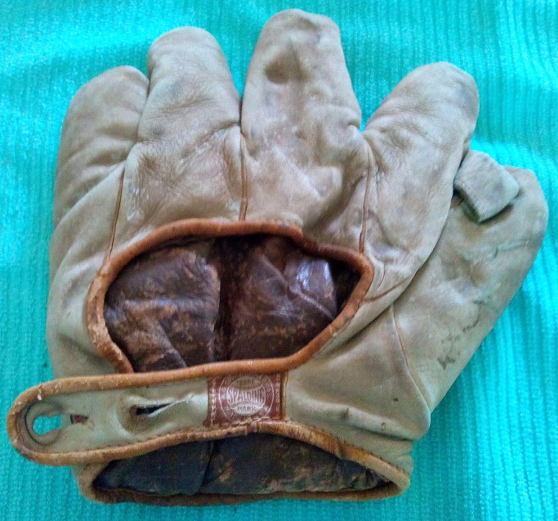 A 1920's Spalding 1" sewn web glove, "Short Finger" model SS, sold for $238. Shows some wear but overall good condition with some markings still visible in the pocket. Nice cloth patch.