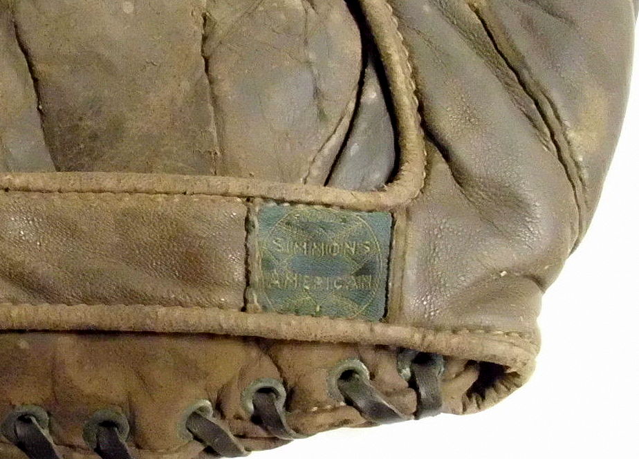 A full web glove sold on ebay for $141. Not mentioned in the description but the glove's big claim to fame is a cool celluloid wrist strap button. The glove was sold through Shapleigh's Hardware of St. Louis. the button reads "Diamond Manufacturing Co". and "Diamond Brand". There is also a "Diamond Brand" logo faintly in the pocket. These were just two of Shapleigh's many in-house trademark brand names. The glove itself was well used with a loose seam or two but mainly presentable and of decent quality.