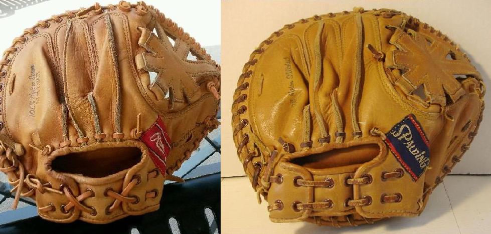 Different yet the same, two great catchers mitts from the mid 1960's. The Rawlings "Ed Bailey" HOH mitt with the "Big Wheel" web sold for $78. Rawling's also made this Spalding "Yogi Berra" mitt with the "Spoke Web". It sold for $102.