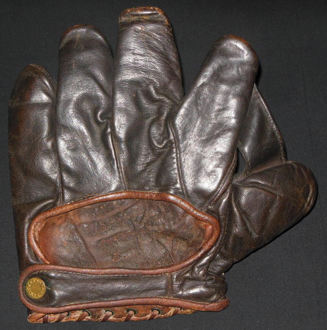 An interesting 1920's "King Patent" style glove sold for $107. Definitely not a Spalding/Reach model. There is a diamond shaped logo in the palm with a stylized "G" in the center. No idea what mfg. that might be. The glove has some condition issues such as seam separation, holes in the palm and a missing tunnel loop web which may have kept the price down.