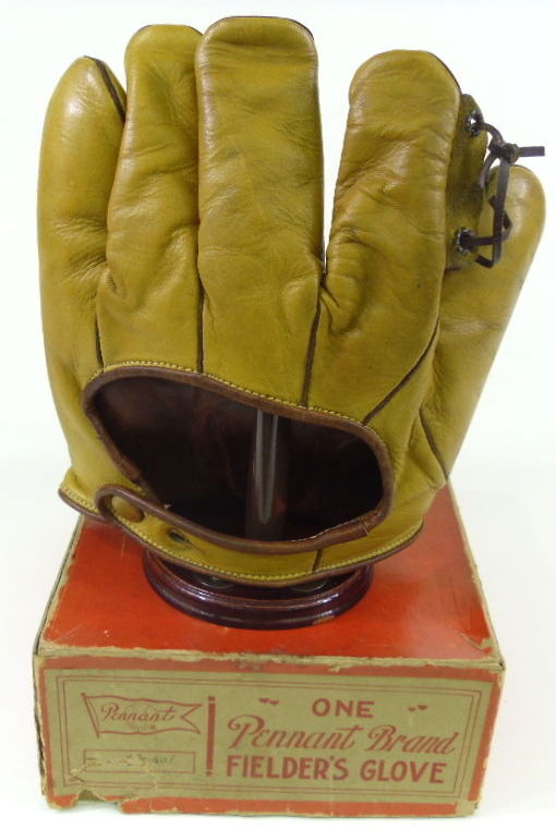 A Pennant brand glove with box sold for $222. Near mint glove with rolled leather piping, grommet web and stellar markings in the pocket. Seems like a bargain for such a high quality item.