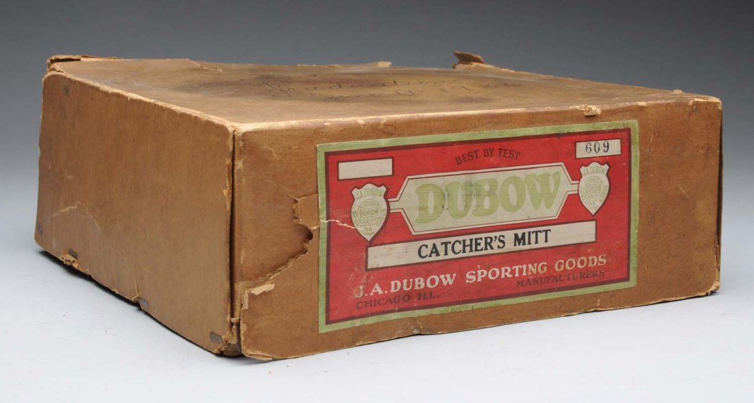A Dubow catchers mitt W/box and a "Chuck Klein" glove sold together for $240. There was also an old no name baseball. Glove & mitt are mid-line models. The mitt is near mint and really a beauty. The box is pretty thrashed. The Klein glove is so-so.