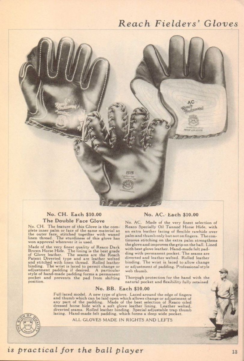 Browsing through JD's library came across this page from the 1926 Reach catalog. The model BB, a top line glove that featured lacing around the fingers which allowed the owner to customize the padding. From what I can tell it lasted one year only. Curious as to whether any other manufacturers offered this style of glove and does anyone out there have a picture of an example?