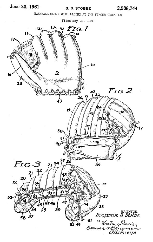 There is a modern patent by Benjamin Stobbe as assignor to Wilson Sporting Goods that proved to be somewhat elusive to me. I could not easily find an actual glove example. The 1961 patent is basically a finger cinch lacing mounted above the wrist opening.