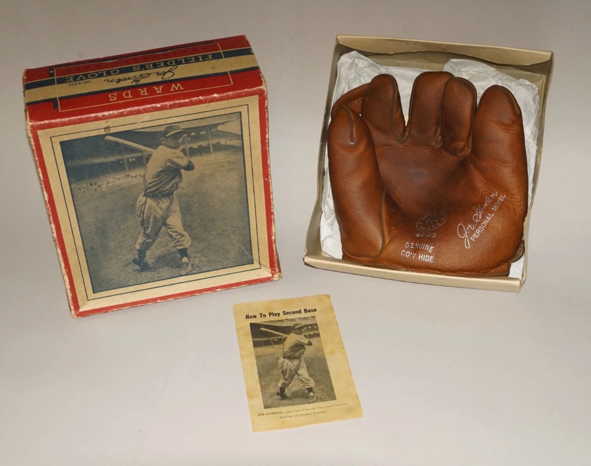 A 1940's Wards Joe Gordon model 4205 glove with original picture box sold for $317. Lower line glove with coated cloth piping and a really nice picture box.