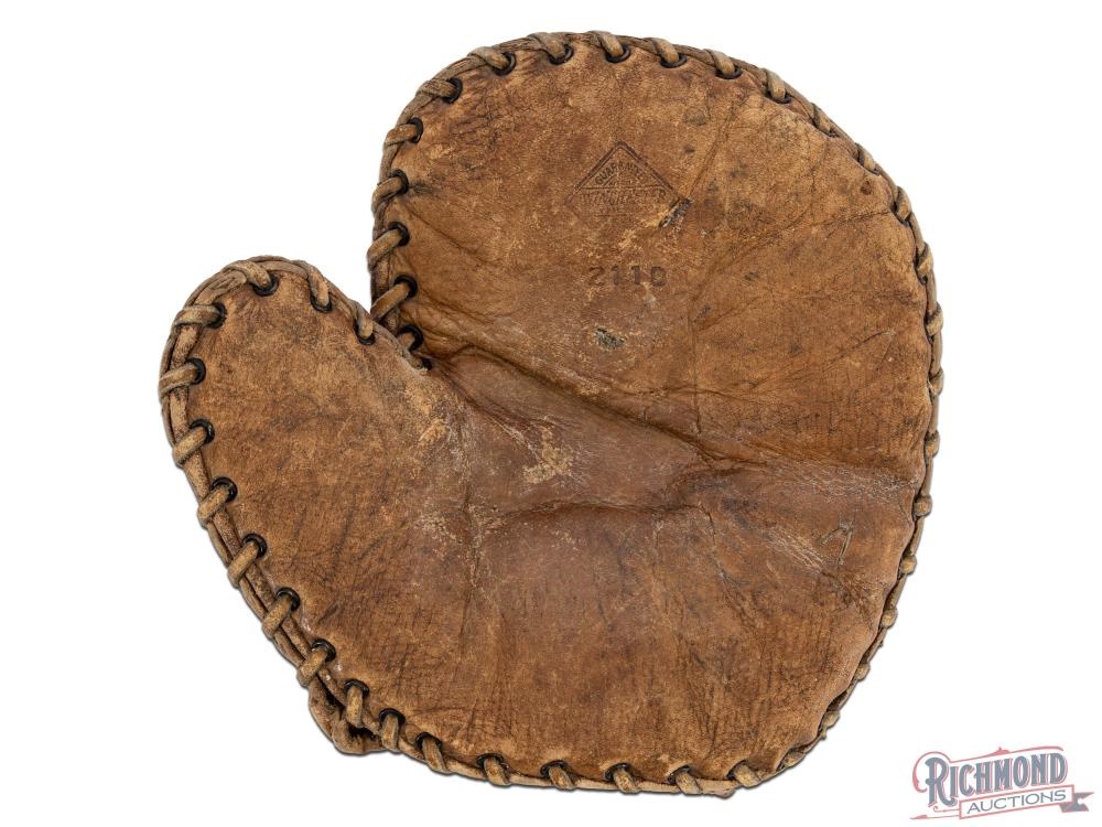A circa 1910 Spalding full web baseball glove sold for $585. It has the typical narrow wrist opening and diverted finger seams. It's all intact, high quality and in decent condition with general play wear.