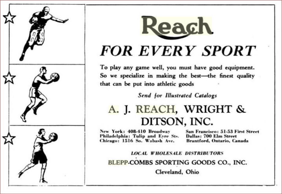 An interesting 1930's glove sold for $185. It is labeled as a Reach model BC . There isn't a model BC in the catalog. The pocket is stamped Blepp Coombs in block letters. Blepp-Coombs was a sporting goods uniform maker in Cleveland. They branched out as a retailer of general sporting goods and distributed Reach, Wright & Ditson products. The glove itself is a mid/lower line model in pretty nice shape.